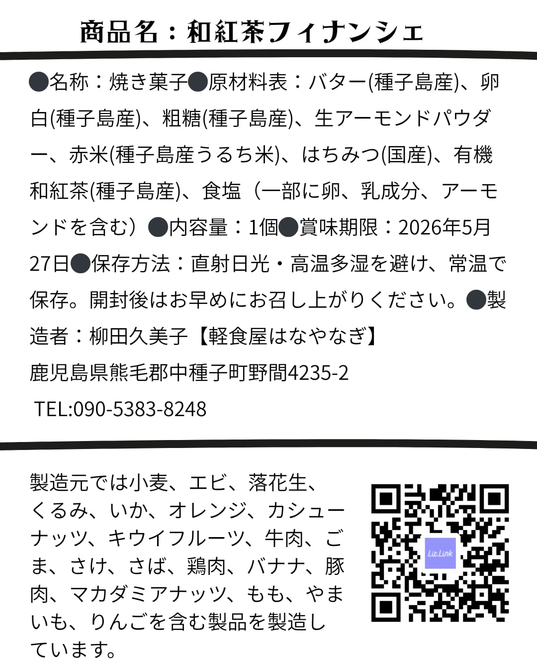 バター(種子島産)・卵白(種子島産)・粗糖(種子島産)・アーモンドプードル・米粉(種子島産うるち米)・蜂蜜(国産)・和紅茶(種子島産)